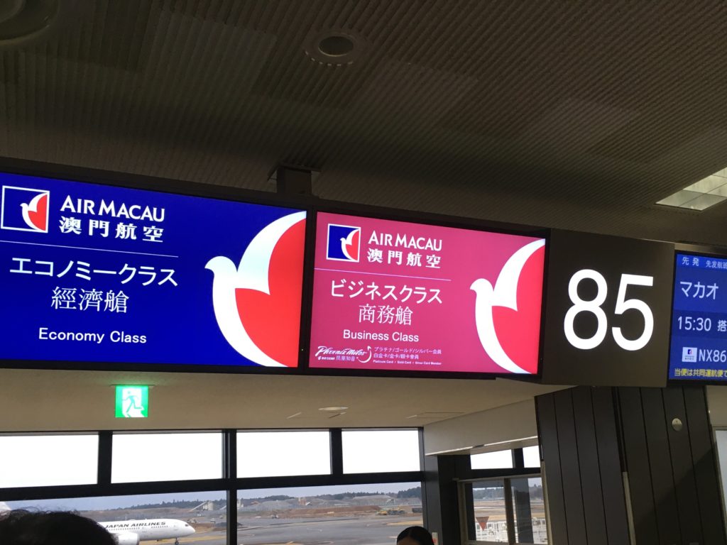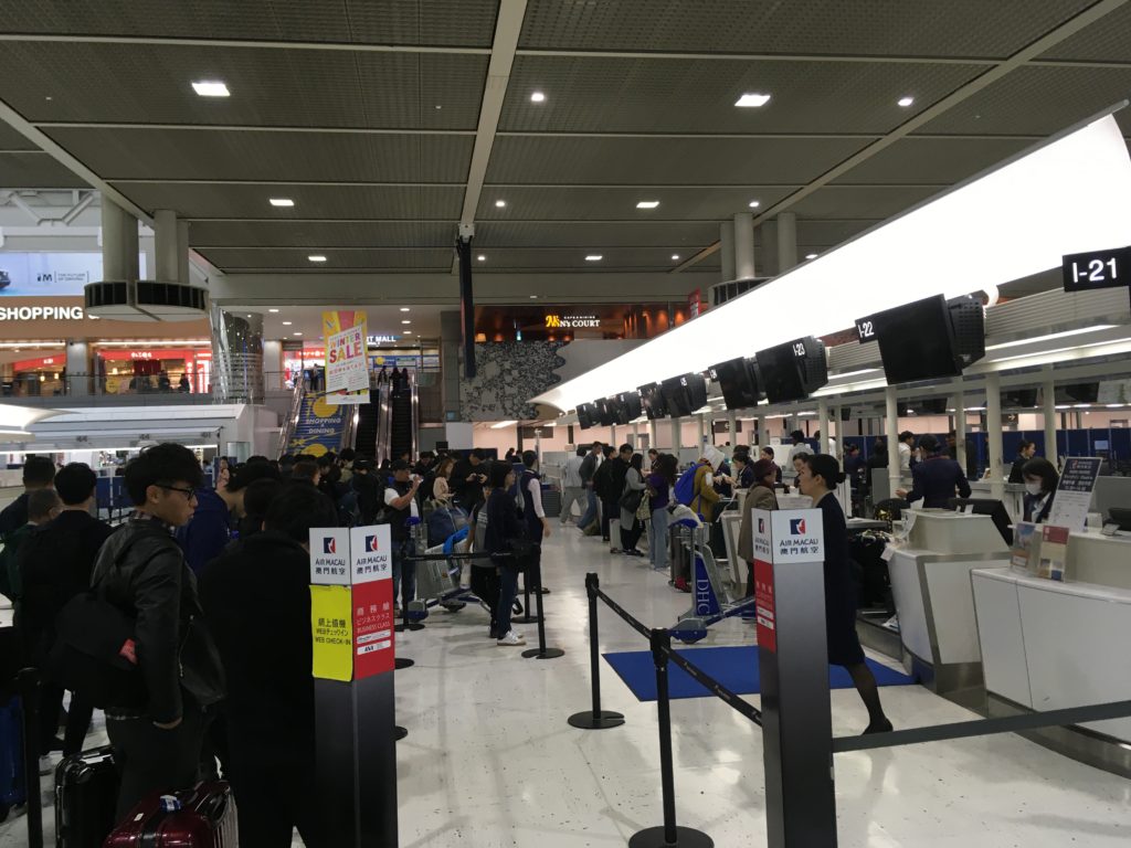 出発階の3階のマカオ航空カウンターで手続きです。チェックインカウンターの係の人はJALの人でした。15:30発のフライトで13:30頃に到着しましたが、エコノミーの窓口は長蛇の列。(多分40~50人くらい待っている?)一方ウェブチェックイン済みの人の列は2人、ビジネスクラスの窓口も列は2人だけ。