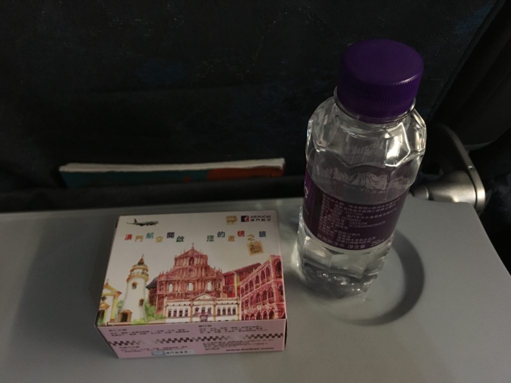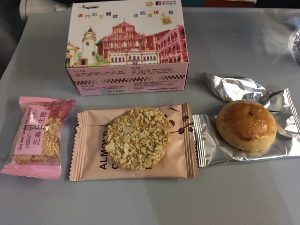 ダナン便はマカオを午後9時過ぎ発なので、食事の提供はなくマカオ名物のお土産の店のお菓子と水が配られました(でも一番有名なアーモンドクッキーは入っておらず…)。