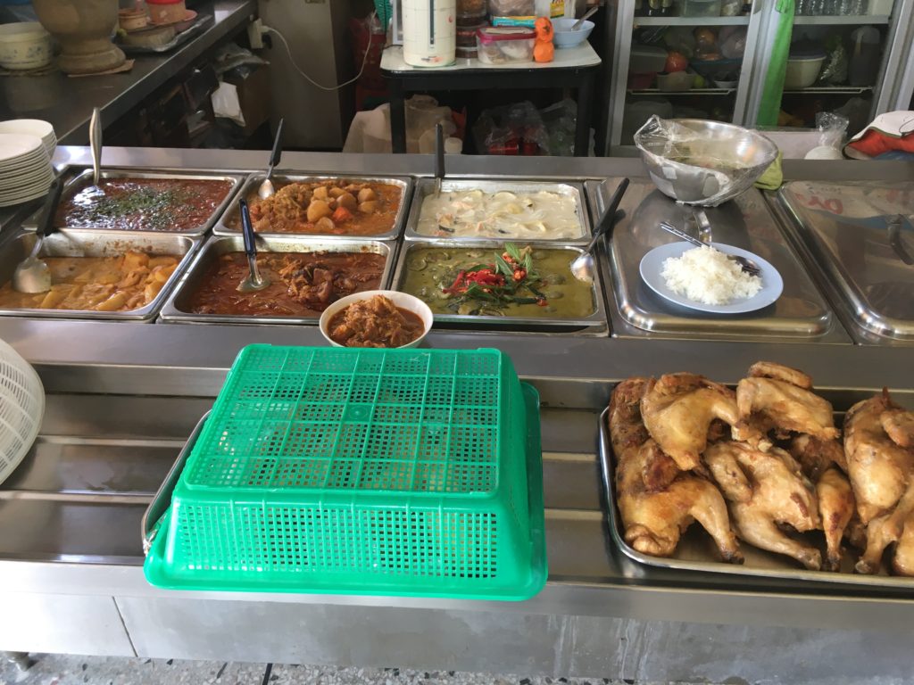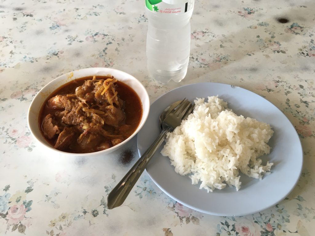 カレー70バーツ、ライス10バーツ、水(ペットボトル)10バーツ計90バーツ(300円くらい)でした。