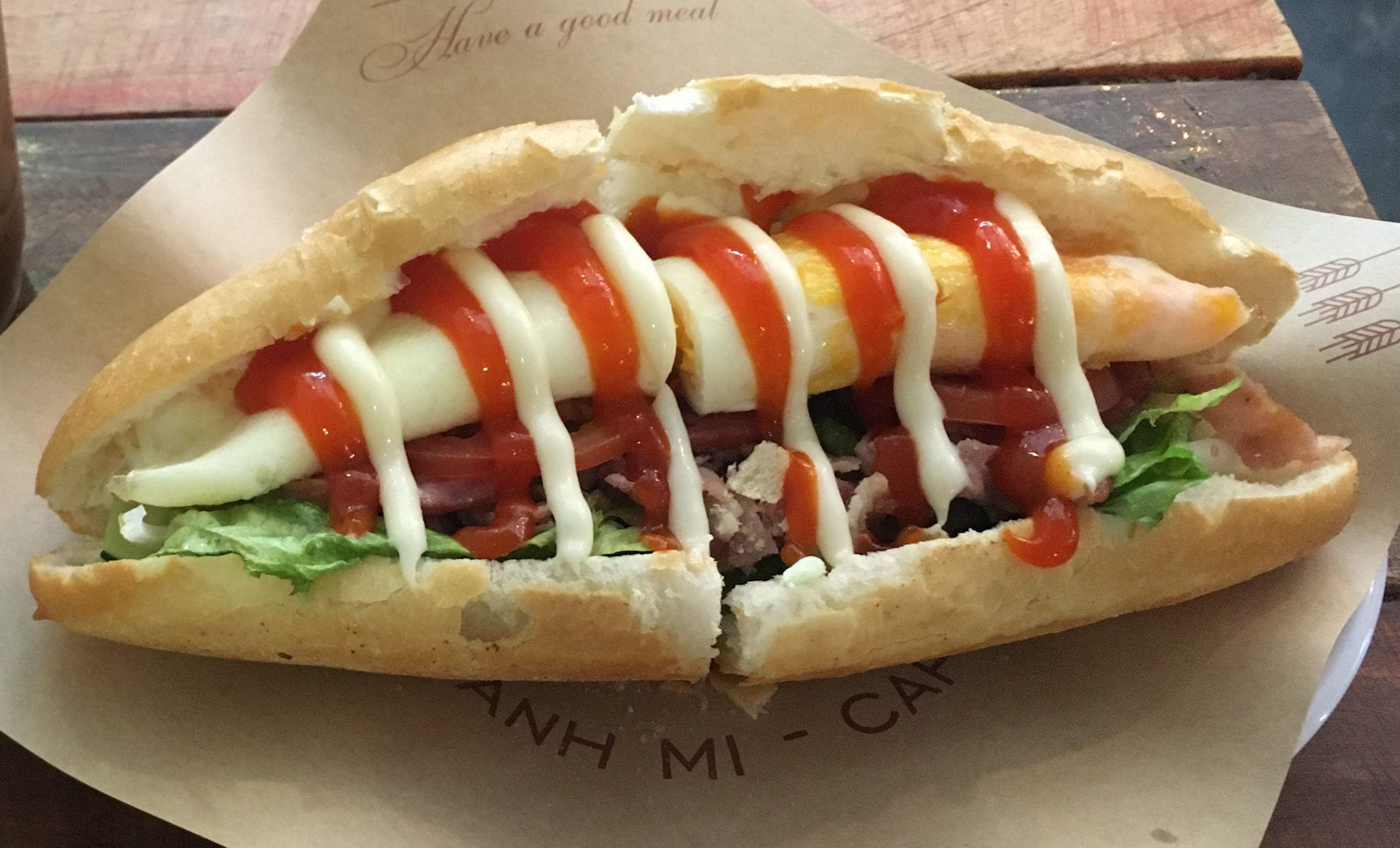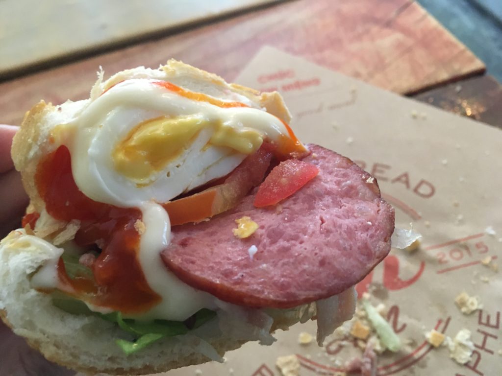 お味はというと、パンは普通のフランスパンよりも柔らかくフワフワ。中身はバインミーというよりもイングリッシュブレックファーストみたいな味ですw。玉子とベーコン、ハムとケチャップとマヨネーズに野菜の組み合わせのまさにそういう味w。