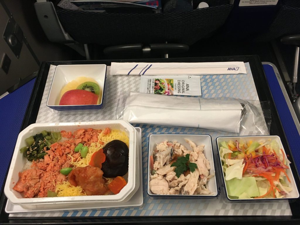 夜便の食事は、離陸してから軽食(ツナのトルティーヤ)と飲み物が配られます。ですので、お腹が空いてない状況で搭乗したほうが良いと思います。そのあとは着陸2時間半前くらいに朝食が出ました。朝食は鮭ご飯かパンケーキでした。しばらく和食とお別れなので鮭ご飯にしてみましたw。