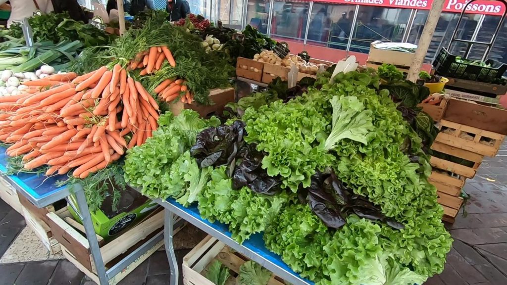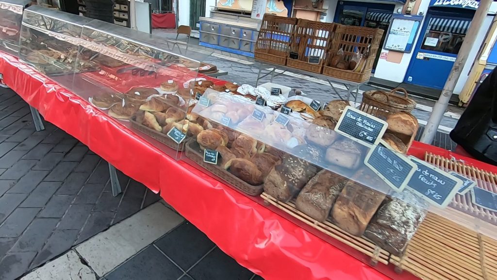フランスの市場はどこに行ってもだいたいこんなラインナップな感じですねw。場所によってはもう少しファストフード的なお店もあったりしますが。買うものはあまりないと思いますが見るだけでも楽しいと思います。