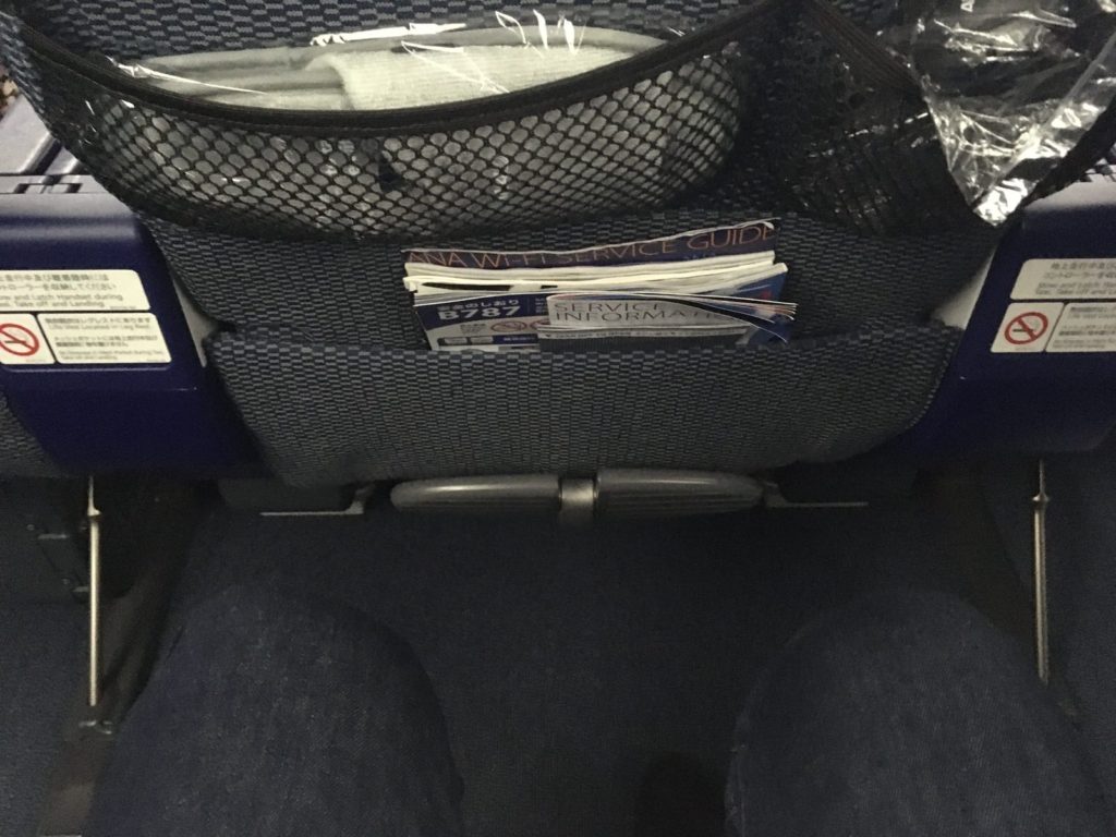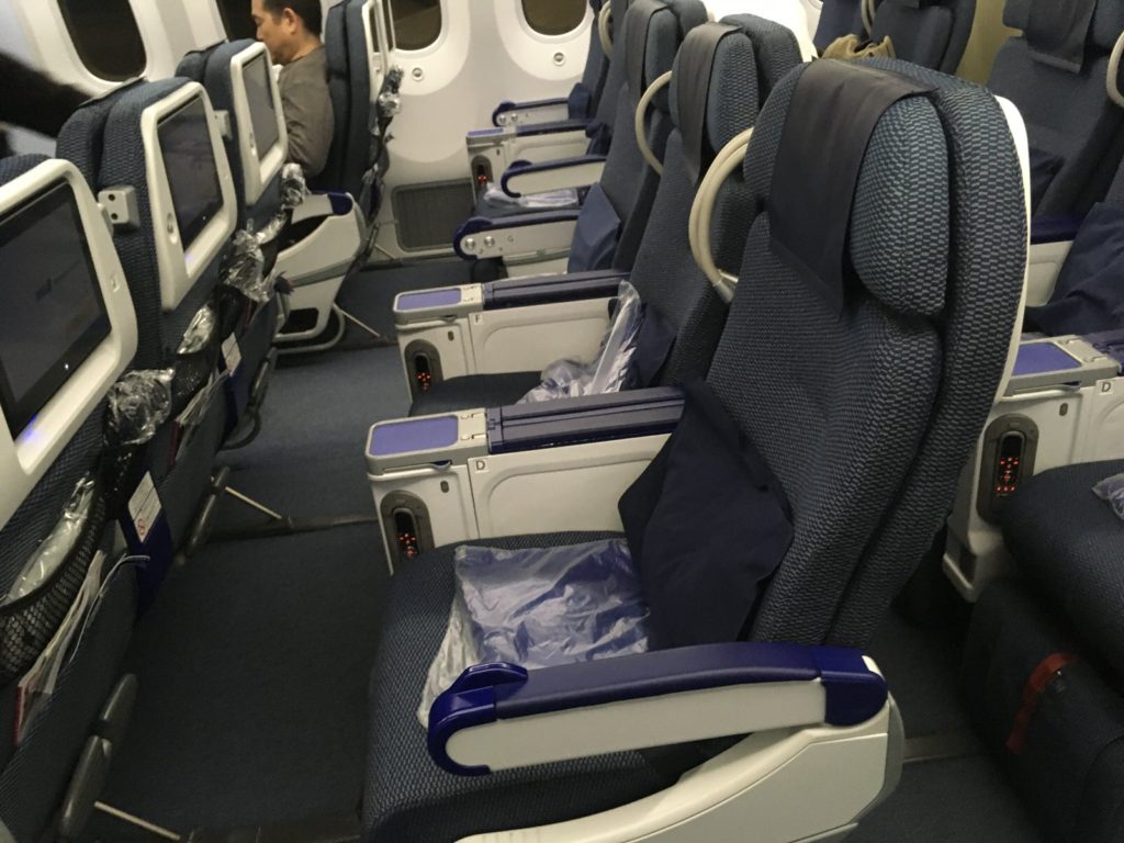 席の形態は行きと同じですが、今回は2-3-2の席配置の真ん中3席の真ん中の席です。この日はプレミアムエコノミーは満席のようでした。